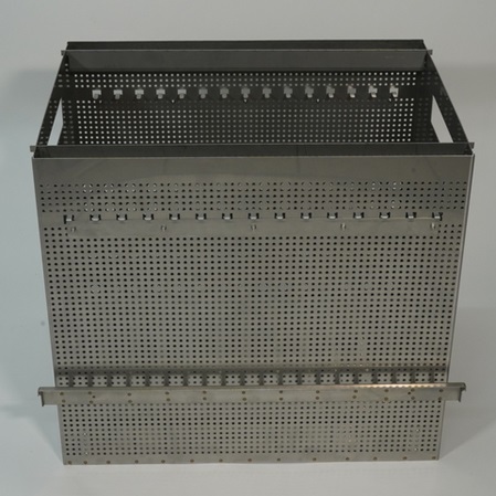 Siebkorb D4Es kann Entdeckelungswachs und es können Rähmchen hängend oder auf den Seitenteilen stehend aus-geschmolzen werden. Unter den Rähmchen ist ein grobes Gitter auf dem die Rähmchen stehen. Darunter ist ein Freiraum in dem das aus den Rähmchen gefallene weiche Wachs-Honiggemisch vollständig ausgeschmolzen wird, während oben bereits eine weitere Serie Rähmchen eingestellt wurde und aufgeschmolzen wird.