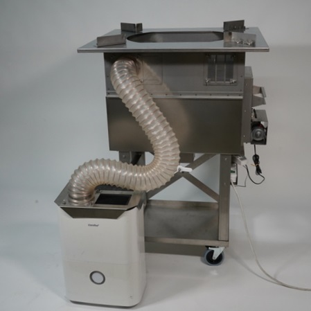 Auf dem Aufsatzrahmen D4 ist ein Heizdeckel D4 aufgelegt. An den Öffnungen des Aufsatzrahmens ist eine Gitterblende mit Luftregelplatte und ein Schlauch mit 2 Bundkragen mit Flansch montiert. Ein Lufttrockner bläst durch den Schlauch trockene Luft.