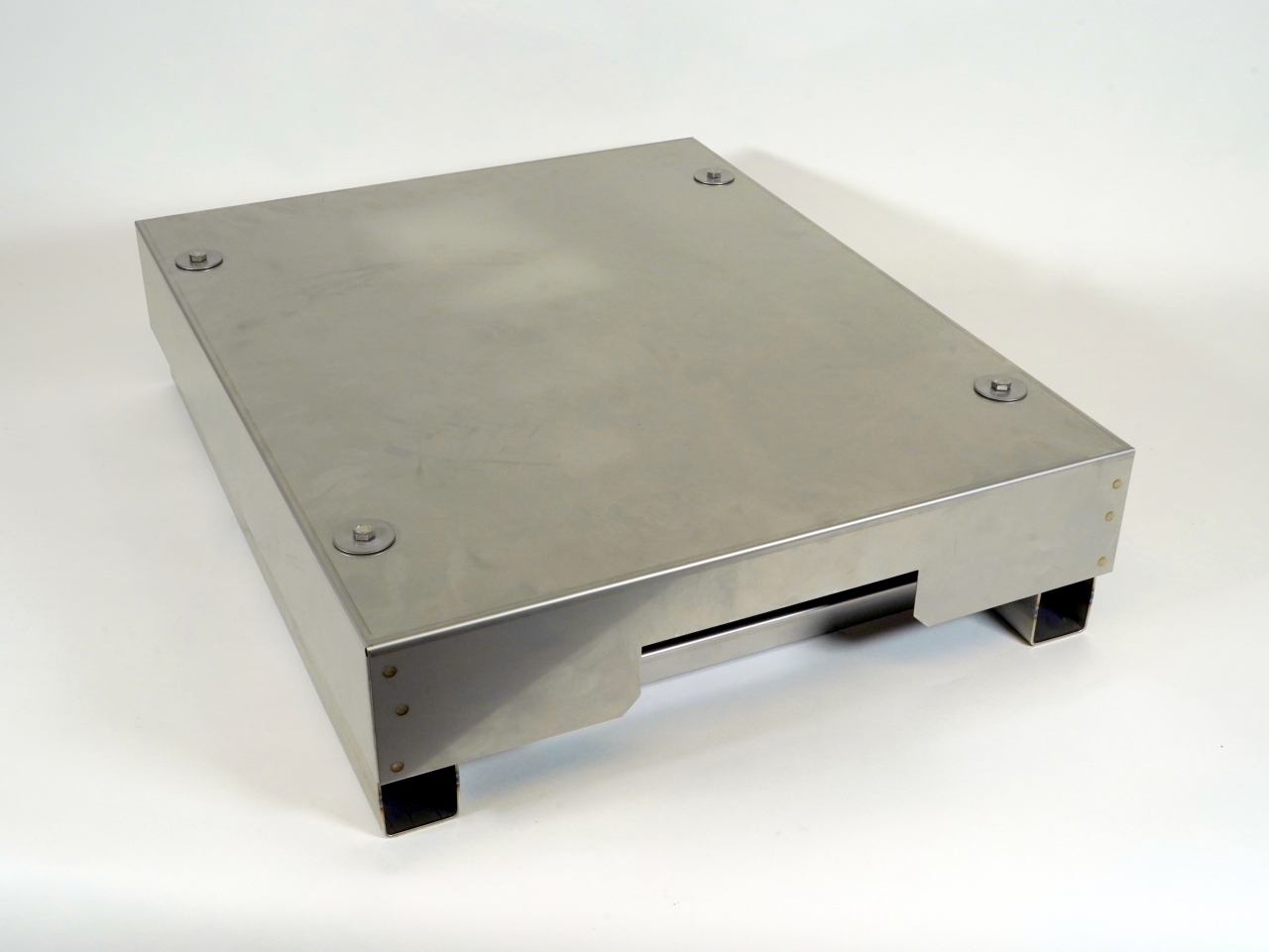 Die Wägezelle ist nicht Bestandteil des Lieferumfanges. Die Schrauben zur Befestigung der Wägezelle am Gestell, sowie das Schraubenmaterial zur Hubbegrenzung und zwei Distanzplatten aus Aluminium für die Wägezelle sind Bestandteil des Lieferumfanges. Am unteren Gestellteil ist ein Edelstahlprofil eingeschweißt, auf dem eine Kunststoffbox mit maximal 90 mm Höhe befestigt werden kann.
