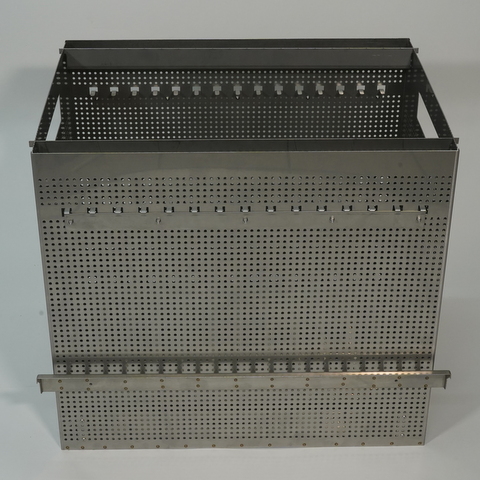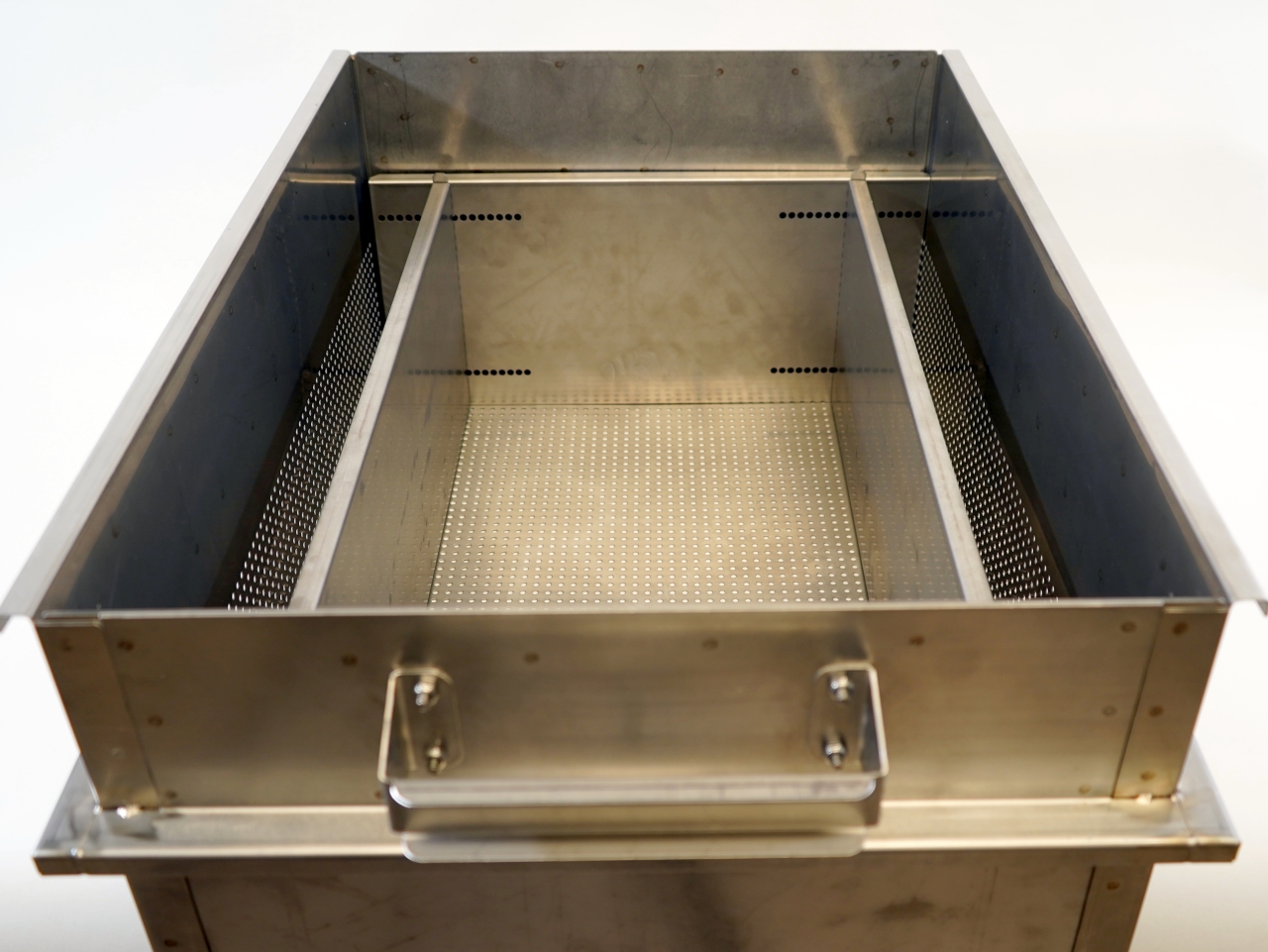 Siebkorb D4Es kann Entdeckelungswachs und es können Rähmchen hängend oder auf den Seitenteilen stehend aus-geschmolzen werden. Unter den Rähmchen ist ein grobes Gitter auf dem die Rähmchen stehen. Darunter ist ein Freiraum in dem das aus den Rähmchen gefallene weiche Wachs-Honiggemisch vollständig ausgeschmolzen wird, während oben bereits eine weitere Serie Rähmchen eingestellt wurde und aufgeschmolzen wird.