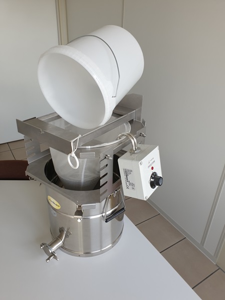 Der Spitzsiebhalter wird so eingestellt, dass das Sieb den Eimerboden gerade berührt. Dadurch schichtet der abfließende Honig nicht und es bildet sich weniger Schaum.